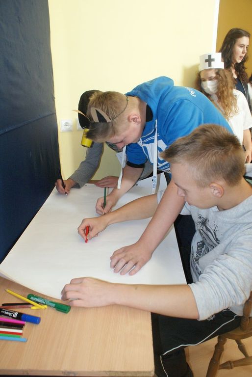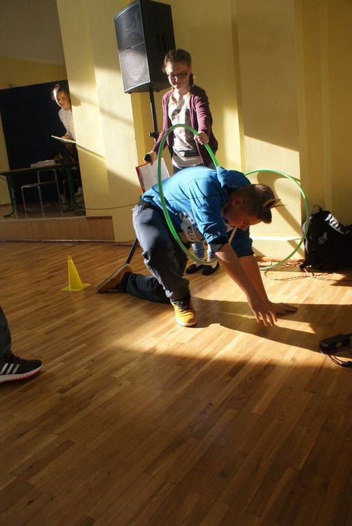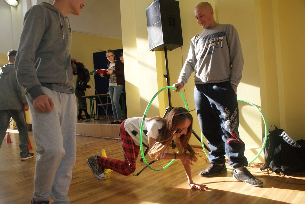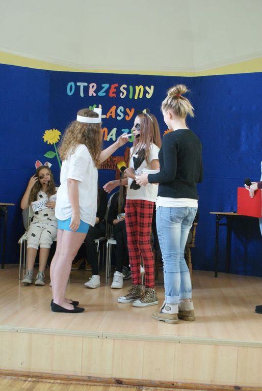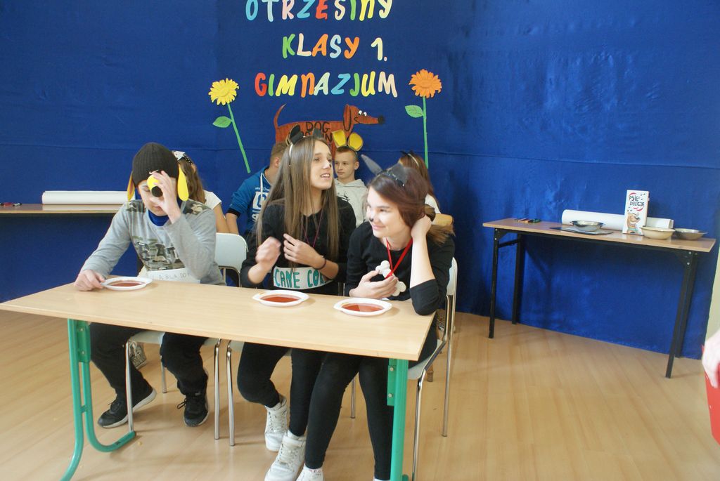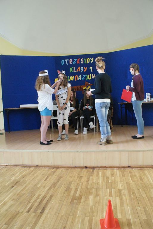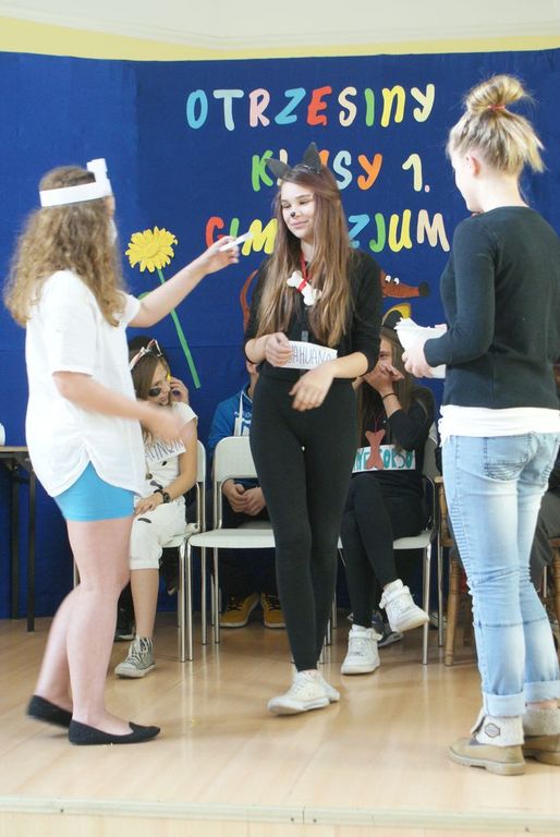 Po wstępnej prezentacji zostali poddani różnym żartobliwym testom sprawnościowym oraz musieli zdać egzamin z wiedzy o naszej szkole. Po pomyślnym zdaniu „egzaminu” na gimnazjalistę uczniowie klasy I zostali w nagrodę obdarowani słodyczami.