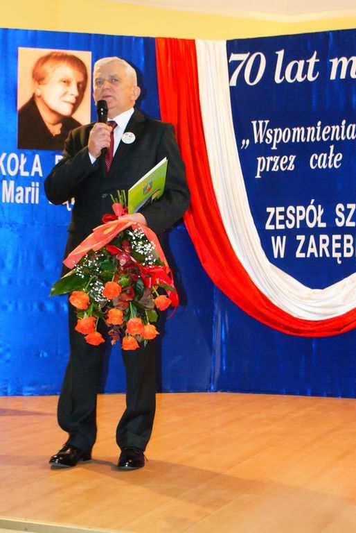 W kolejnej części uhonorowani zostali byli dyrektorzy, nauczyciele i pracownicy szkoły, którym pan dyrektor wręczył pamiątkowe statuetki i kwiaty. Pierwszy dyrektor Gminnego Gimnazjum w Zarębie, pan Stanisław Śnieżyk, przypomniał okoliczności nadania szkole imienia Juliusza Słowackiego. Uroczystość uświetniły piosenki w wykonaniu zespołu wokalnego pod kierunkiem pana Zdzisława Trędewicza i szkolna schola, a także prezentacje multimedialne przygotowane przez panią Katarzynę Sandecką.