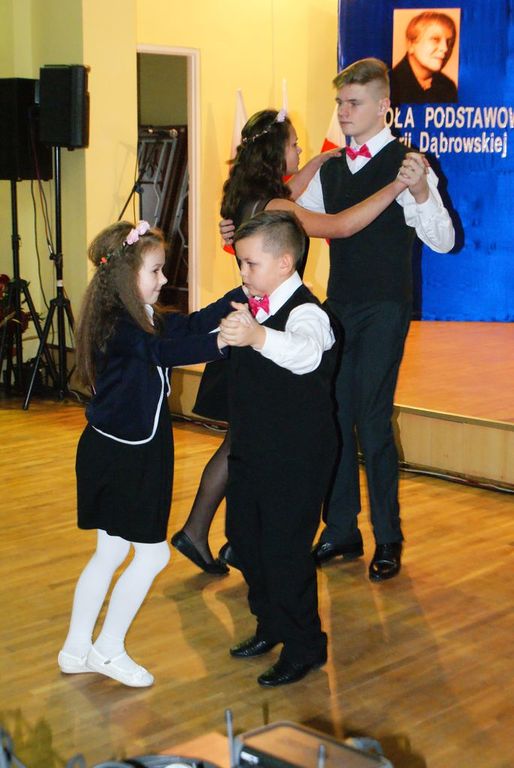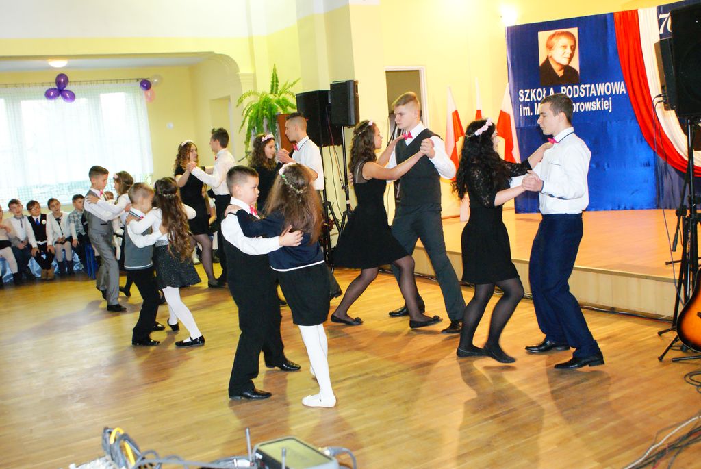 Wehikuł czasu rozpoczął walc w wykonaniu naszych uczniów do melodii z filmu „Noce i dni”. Był to ukłon w stronę pierwszej patronki Szkoły Podstawowej- Marii Dąbrowskiej. Następnie pani Joanna Malik przedstawiła krótki rys historyczny o początkach szkolnictwa w Zarębie oraz zarys monograficzny szkoły.