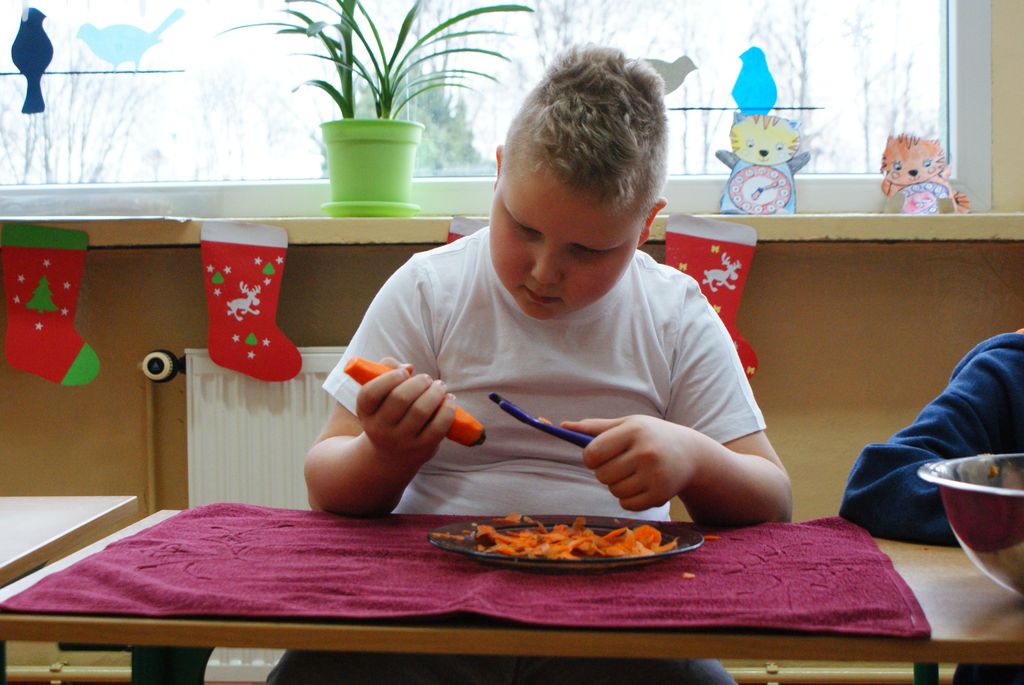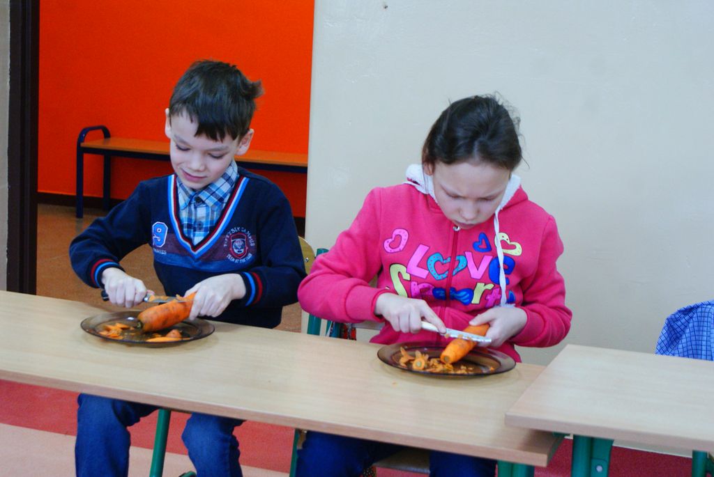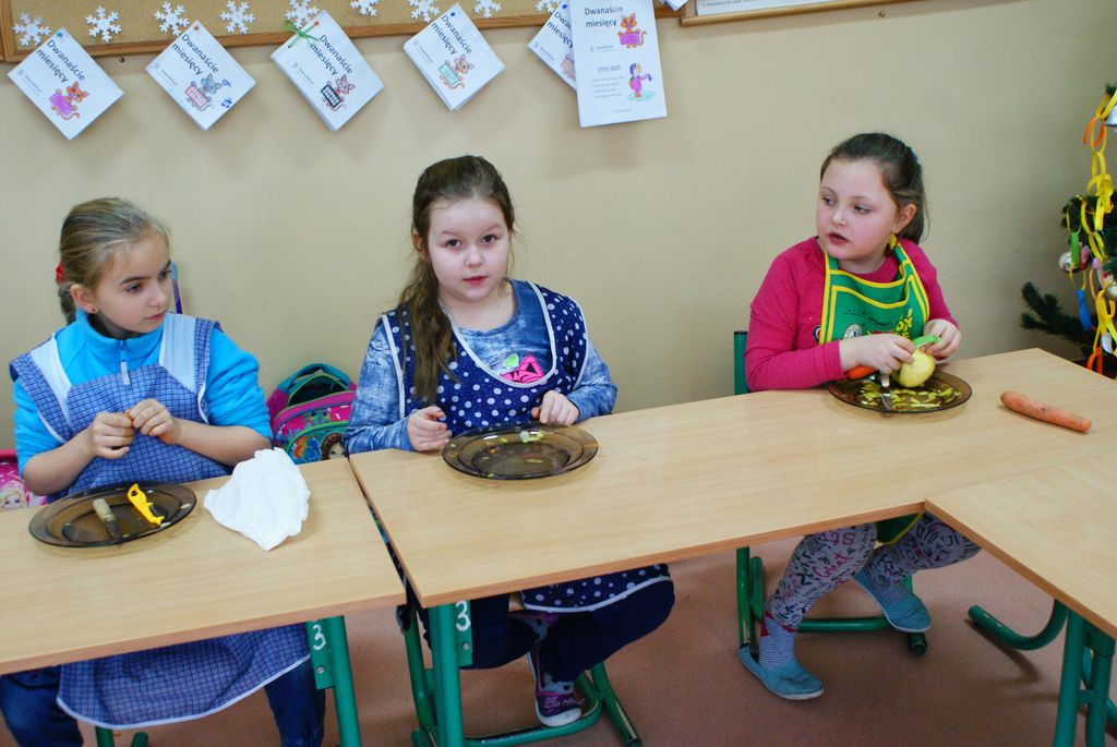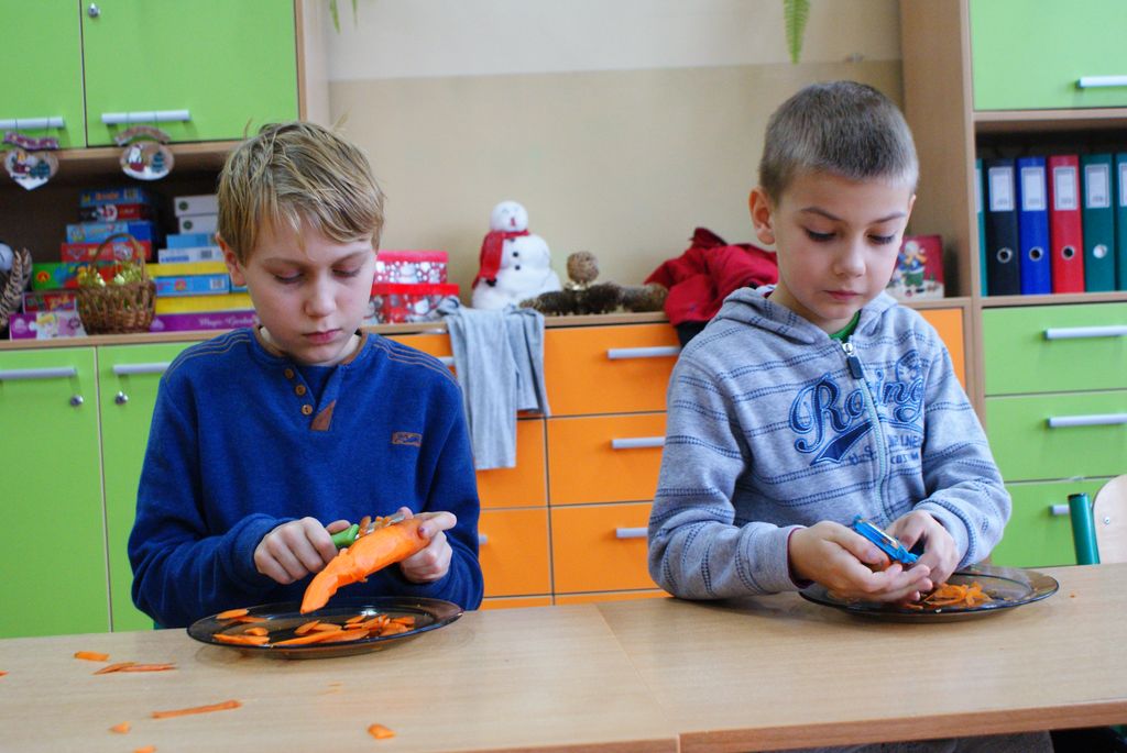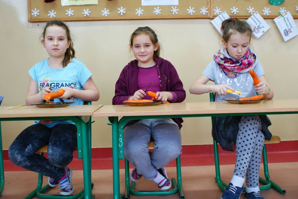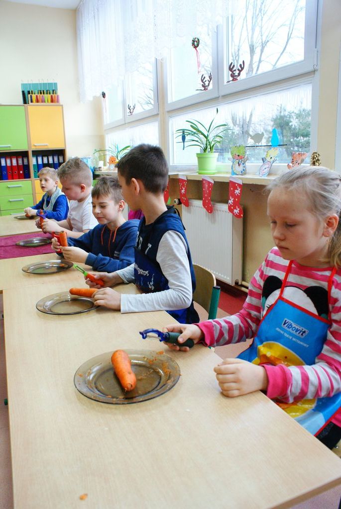 Jednak zanim przystąpiliśmy do pracy dzieci zapoznały się z wartościami odżywczymi owoców i warzyw, poznały urządzenie do robienia soków, jego działanie, a także utrwaliły zasady bezpieczeństwa. Następnie uczniowie przystąpili do praktycznego działania. Nie było dziecka, które nie poradziłoby sobie z umyciem, obraniem oraz krojeniem jabłek i marchewek. Uczniowie wykazali się bardzo dużym zaangażowaniem w pracę, umiejętnościami posługiwania się nożem. Po skończonej pracy wszystkie dzieci z Zespołu Szkół w Zrębie wraz z gronem pedagogicznym delektowali się zrobionym bez dodatku cukru i konserwantów sokiem. Dzieci stwierdziły, że soki zrobione własnoręcznie są pyszne i lepsze od tych kupionych w sklepie.
