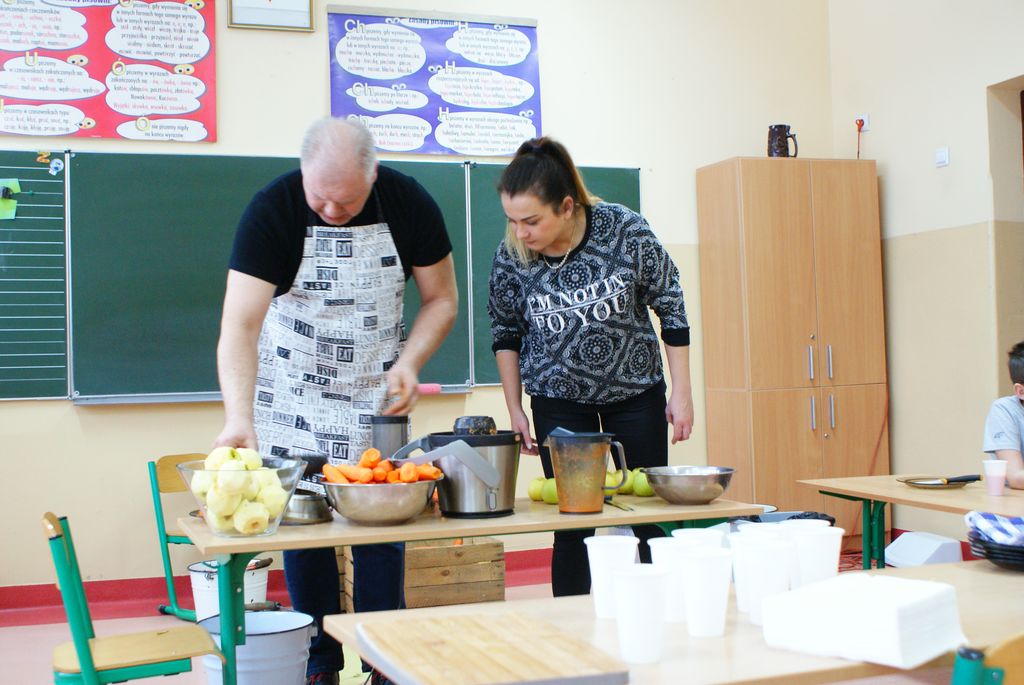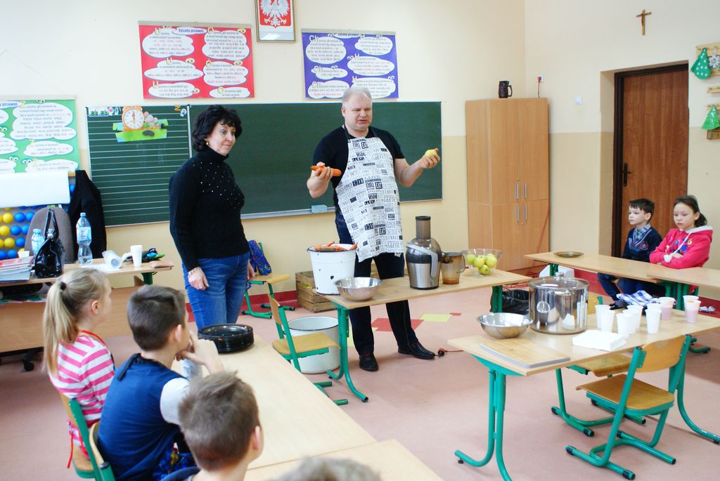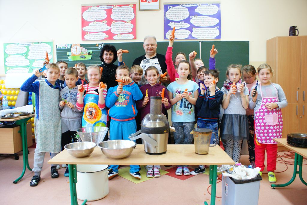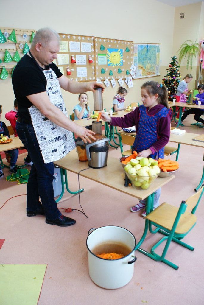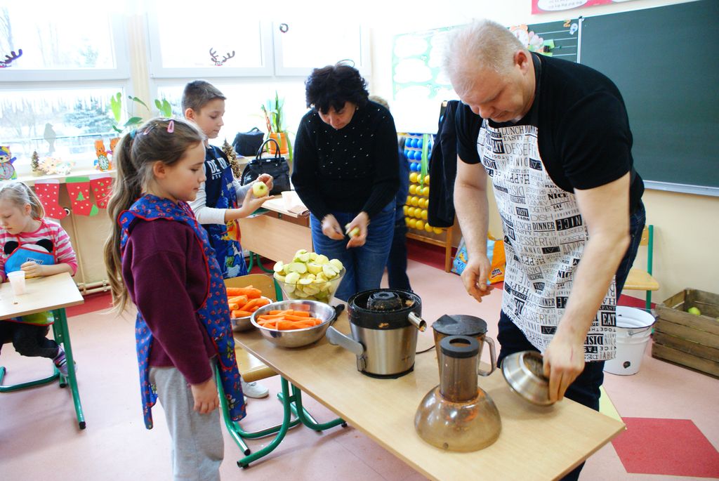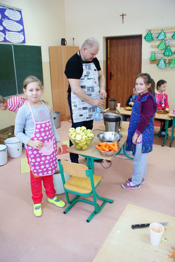 Każdy uczeń naszej szkoły rozumie potrzebę spożywania dużych ilości owoców oraz warzyw. Dlatego mając na uwadze zdrowie naszych wychowanków nie zapominamy o organizowaniu akcji edukacyjnych, które promują zdrowie. Tym razem uczniowie klas II i III Szkoły Podstawowej zrobili sok z jabłek i marchwi. Zajęcia integracyjne poprowadził sam dyrektor szkoły pan Jacek Adamski.