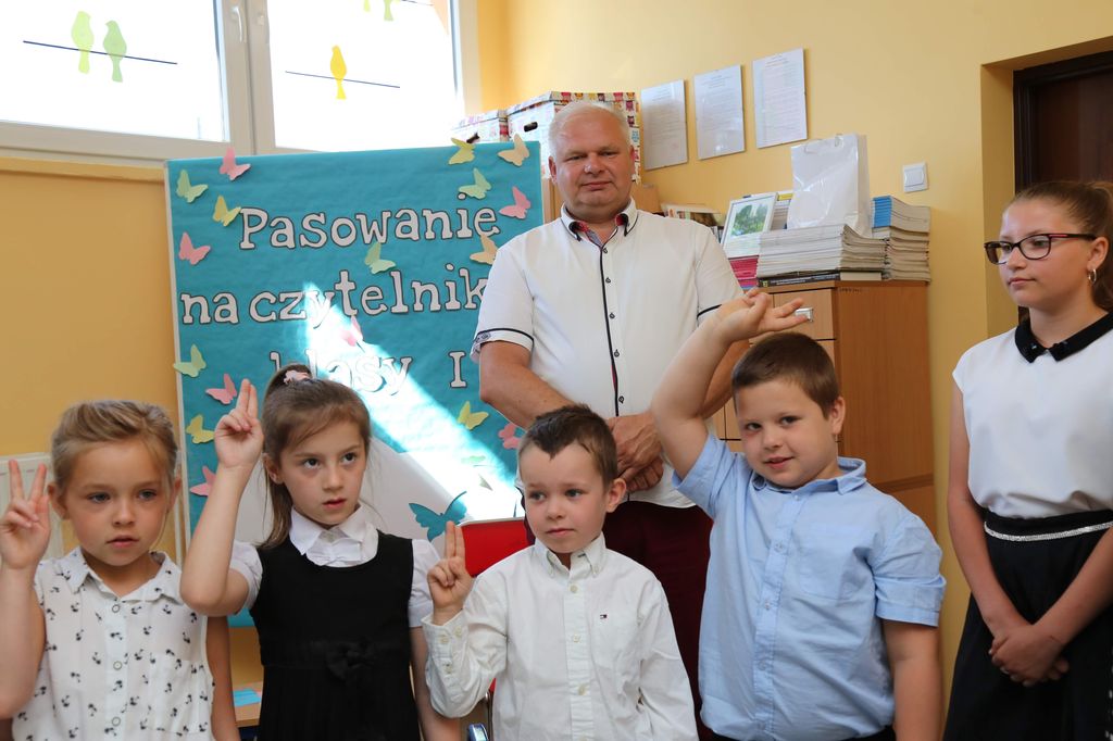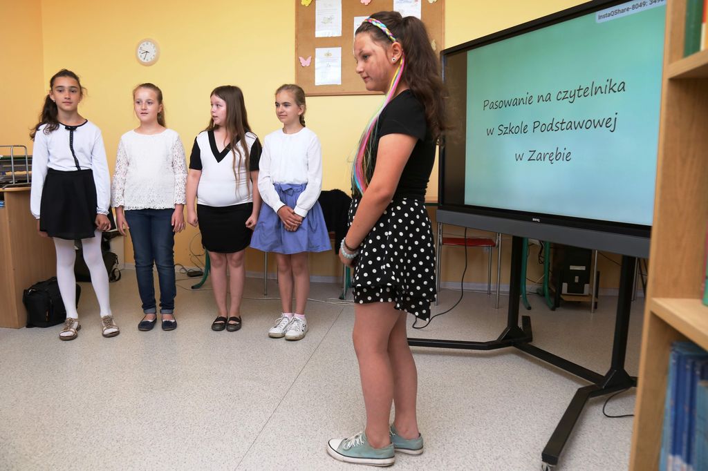 W poniedziałek 3 czerwca 2019 roku uczniowie klas pierwszych dumie wkroczyli w szeregi czytelników biblioteki szkolnej SP w Zarębie. Dzieci obejrzały ciekawy i pouczający program artystyczny w wykonaniu starszych koleżanek: Hani, Laury, Julity, Leny, Gabrysi i Mileny z klasy IV. Uczniowie dowiedzieli się o regulaminie biblioteki szkolnej i zasadach postępowania podczas czytania książki. Złożyły przysięgę czytelnika i otrzymały pamiątkowe dyplomy.