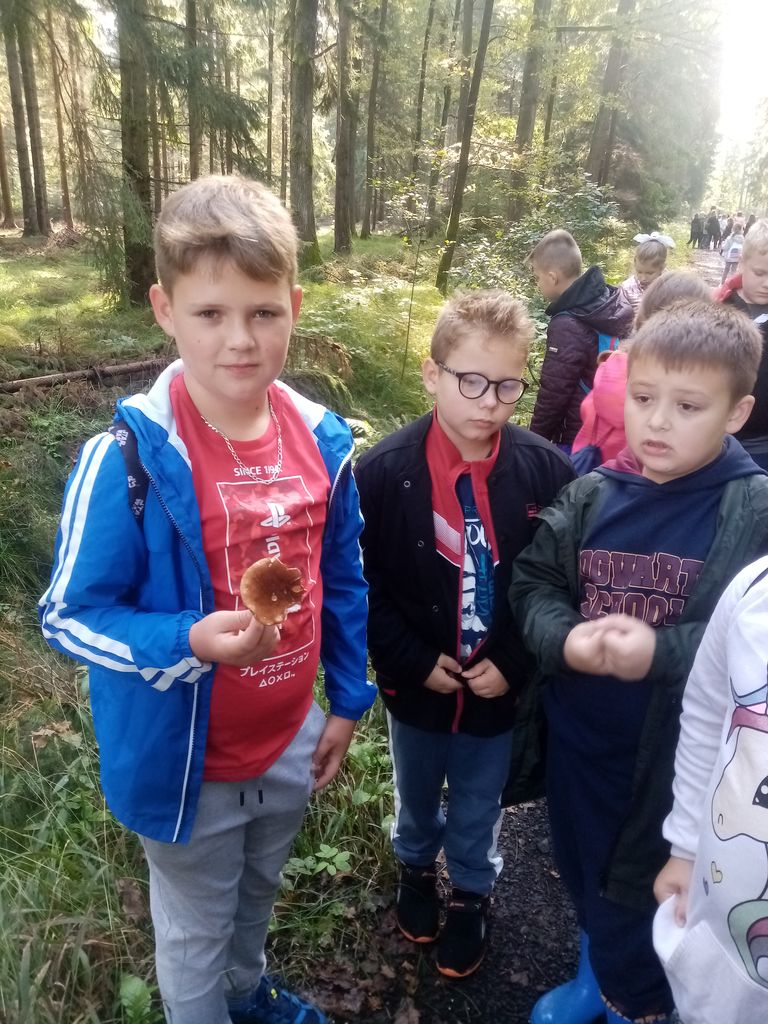 Idąc do lasu dzieci szły przez park obserując zmiany w przyrodzie jesienią: spadające kasztany i żołędzie, kolorowe liście. Będąc już w lesie, uczniowie odpoczywali przy żródełku- posilając się i próbując żródlanej wody. Po krótkim odpoczynku wszyscy poszli na spacer po lesie, połączony ze zbieraniem leśnych darów przyrody: szyszek, grzybów, kolorowych liści. Zebrane dary jesieni, uczniowie zabrali do szkoły, aby wykonać jesienne dekoracje klas.
