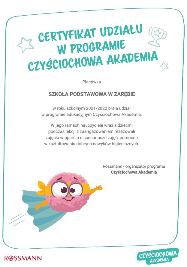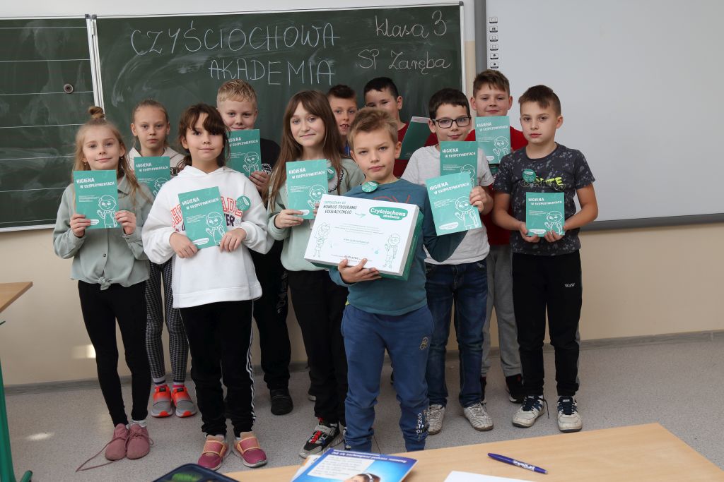 Do programu Czyściochowa Akademia dołączyła także klasa III ze Szkoły Podstawowej w Zarębie, która przez cały rok szkolny, wraz z panią Haliną Ziębą i panią Olimpią Kowal-Gadecką, będzie brała udział w zadaniach Akademii.