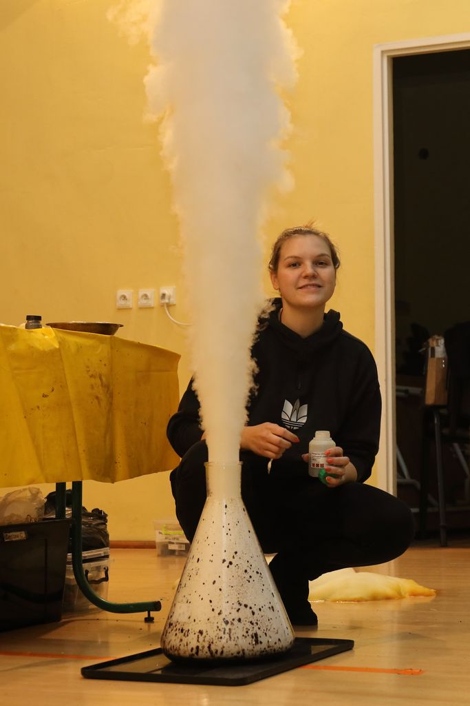 Festiwal, to jedno z działań, które odbywa się w naszej szkole w ramach programu „Z pasją w gminie Siekierczyn”. Na pierwszej lekcji cała szkoła spotkała się w auli, aby wspólnie rozpocząć ten naukowy dzień widowiskowym pokazem chemicznym. Była pasta dla słonia, ciekły azot, ogień na podłodze i wiele innych zdumiewających doświadczeń.