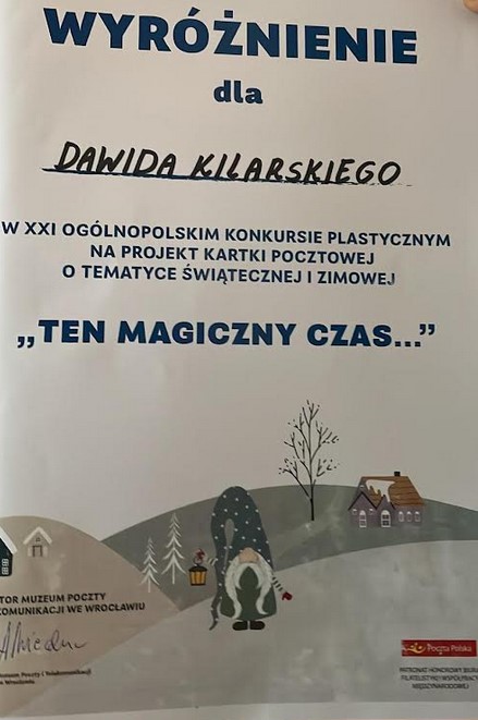 Dawid Kilarski z klasy VIII wziął udział w Ogólnopolskim konkursie plastycznym „Ten magiczny czas…”, którego zadaniem było przygotowanie kartki pocztowej o świątecznej i zimowej tematyce. Organizatorem przedsięwzięcia było Muzeum Poczty i Telekomunikacji we Wrocławiu.