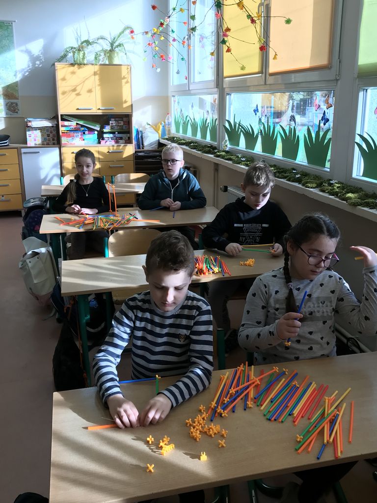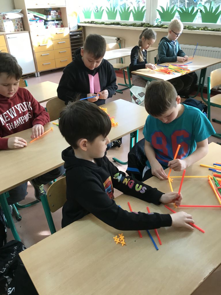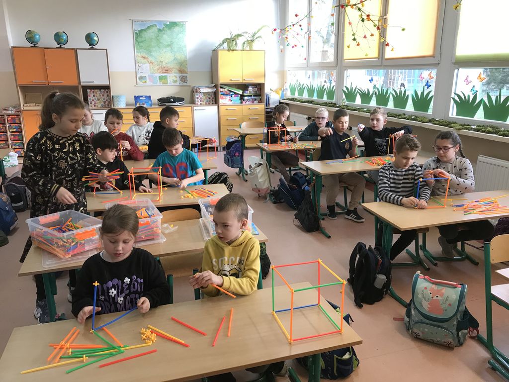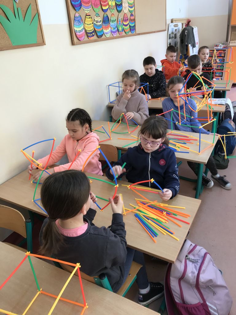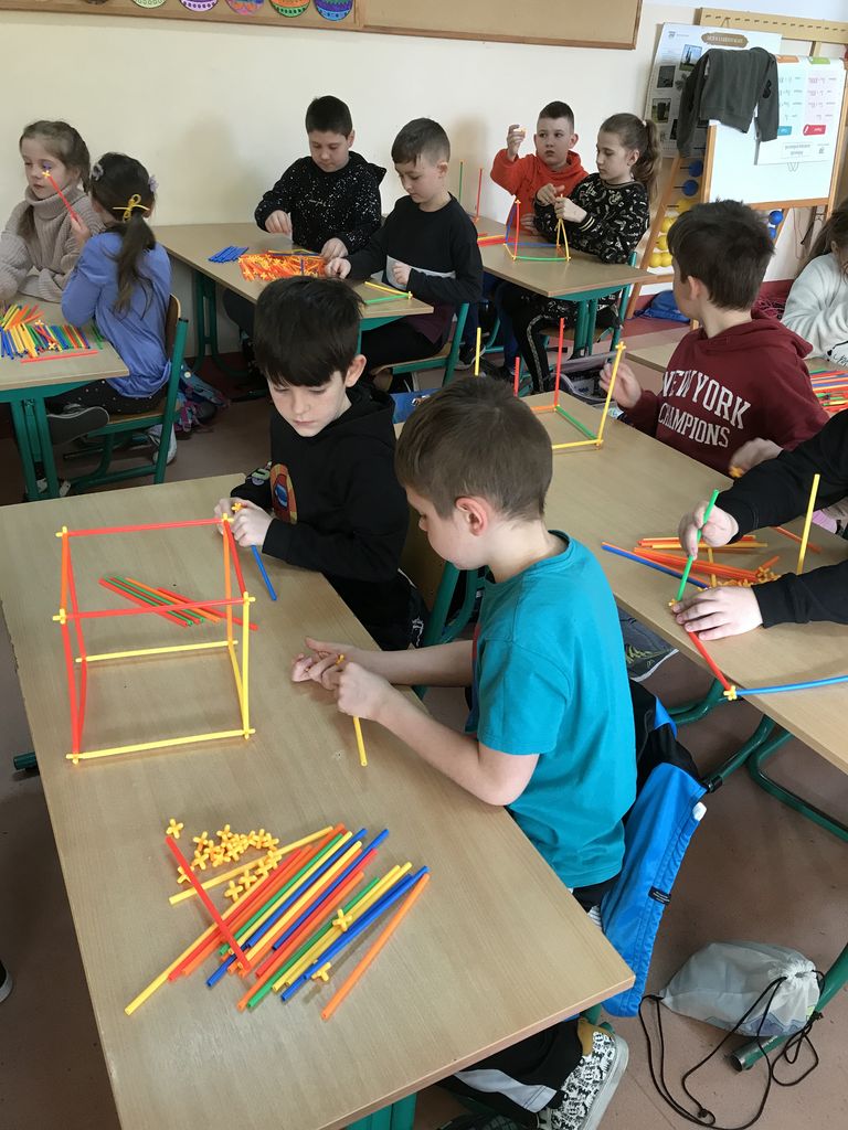 W trakcie zajęć z zakresu edukacji matematycznej uczniowie klasy II tworzyli i opisywali figury przestrzenne. Figury zbudowali ze słomek konstrukcyjnych, które zostały zakupione w ramach realizowanego w naszej szkole programu Laboratoria Przyszłości.
