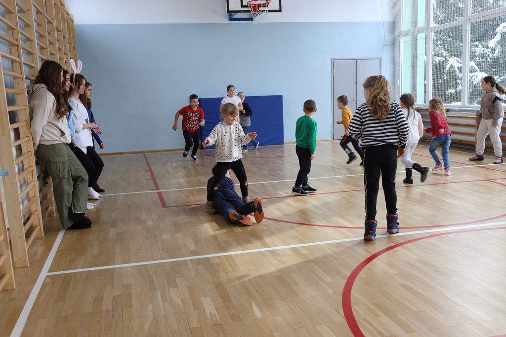Dużą atrakcją spotkania były zabawy ruchowe przygotowane przez uczennice klasy VIII w sali gimnastycznej. Uczniowie klasy III pomogli starszakom wykonać zajączki. Każde dziecko opuściło naszą szkołę z niespodziankę przygotowaną przez Radę Rodziców. Była to teczka z nazwą Szkoła Podstawowa im. Żołnierzy Polskich w Zarębie, w której znajdowały się kolorowanki, pisaki i naklejki. Dużym zainteresowaniem cieszyły się torebki ze słodką niespodzianką.
