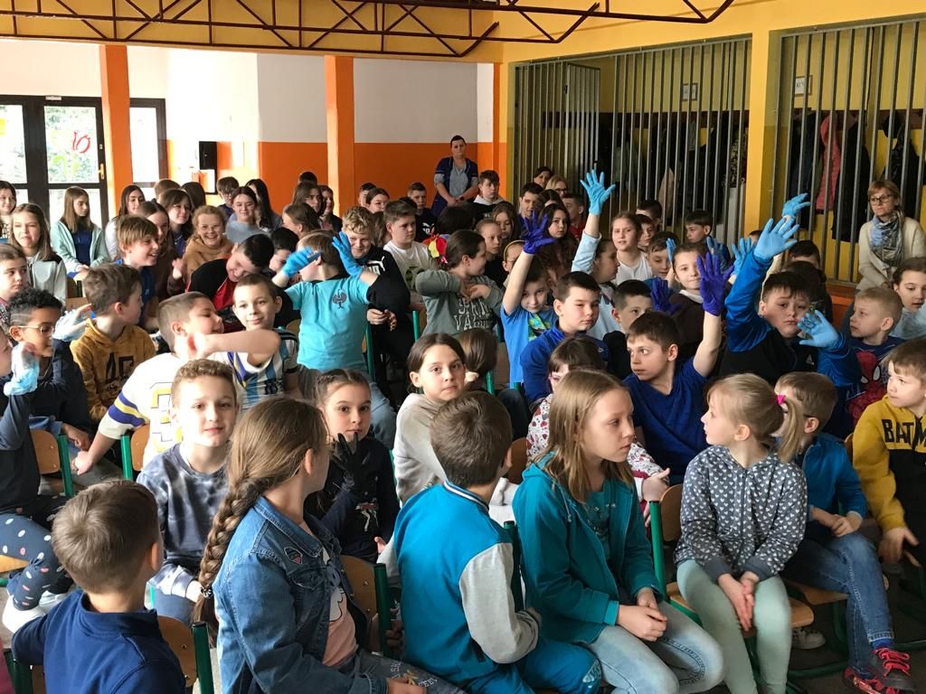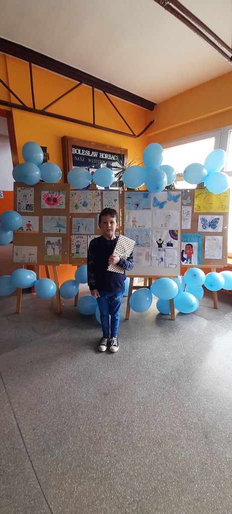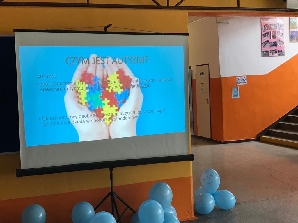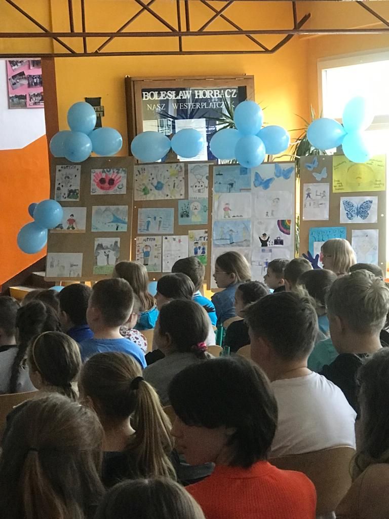 Nasza szkoła również włączyła się w akcję jako znak solidarności z osobami z autyzmem. Z uwagi na to, że w tym roku dzień przypadł w niedzielę, wydarzenie obchodziliśmy 5 kwietnia. Tego dnia wśród uczniów i nauczycieli w ubiorze dominował kolor niebieski. Można było podziwiać galerie prac przedstawiającą trudności osób zmagających się z tym zaburzeniem. Pani Paulina Szatkowska przybliżyła uczniom zagadnienia autyzmu wyświetlając prezentację oraz krótkie filmiki.