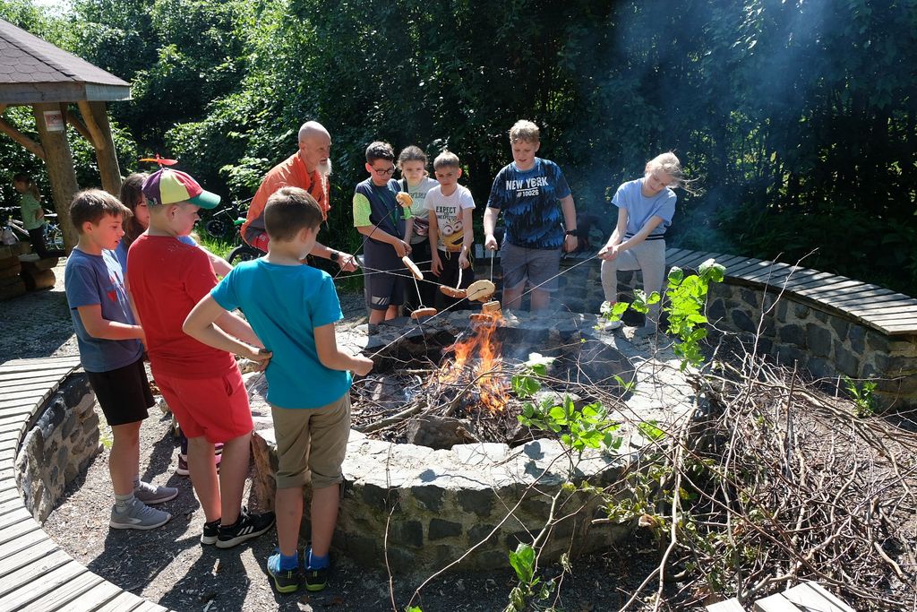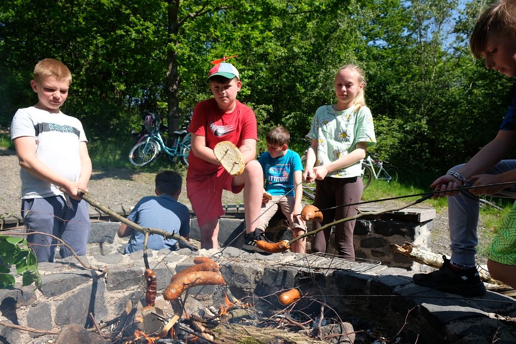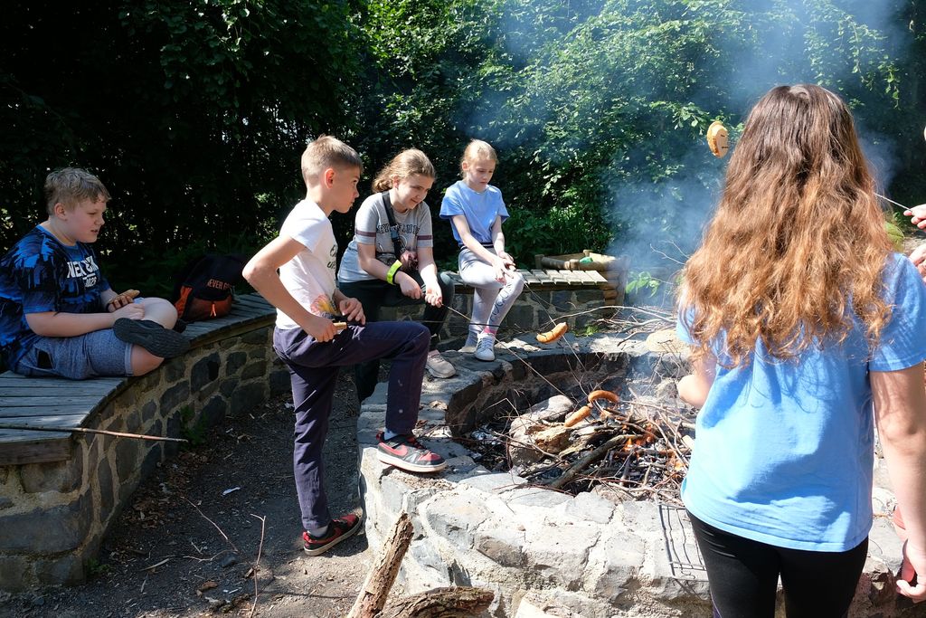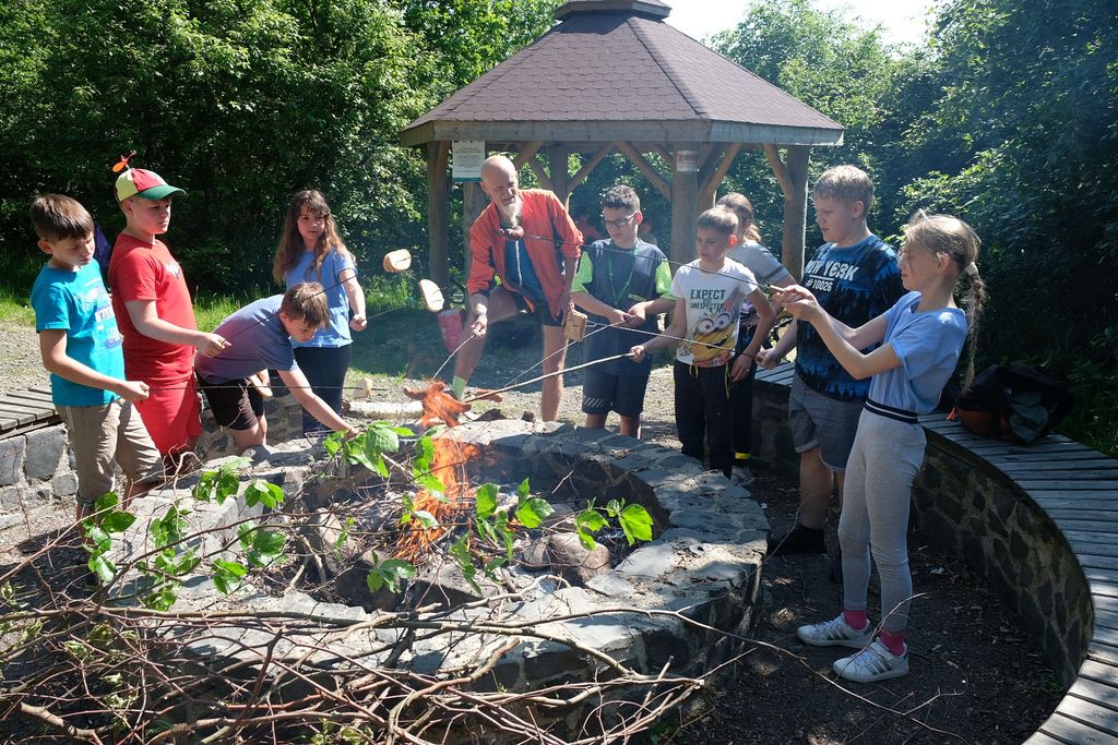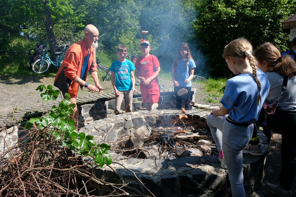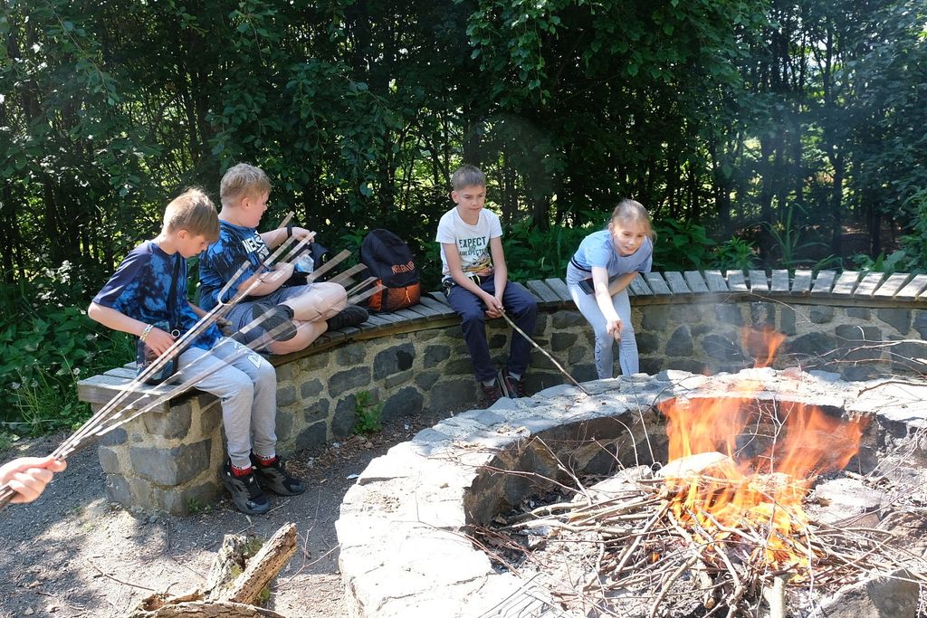Wyruszyliśmy spod szkoły w Zarębie, by potem drogami leśnymi i polnymi dotrzeć do Włosienia, podziwiając po drodze piękne, lokalne krajobrazy. Nagrodą za dotarcie do celu było wspólne ognisko oraz podziwianie piękna okolicy ze szczytu wulkanicznego stożka. Pan Przemek opowiedział nam o historii tego miejsca. W drodze powrotnej mieliśmy okazję zobaczyć Pałac we Włosieniu.