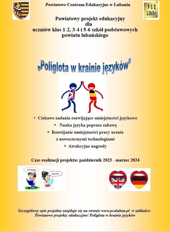 Zachęcamy uczniów klas III – VI do udziału w powiatowym projekcie edukacyjnym „Poliglota w krainie języków”. Konkurs skierowany jest do uczniów klas I – VI. Celem projektu jest rozwijanie umiejętności językowych w ciekawy sposób, nauka języka obcego poprzez zabawę oraz rozwój umiejętności korzystania z nowych technologii.