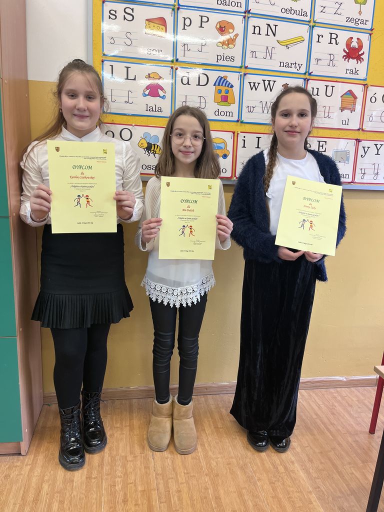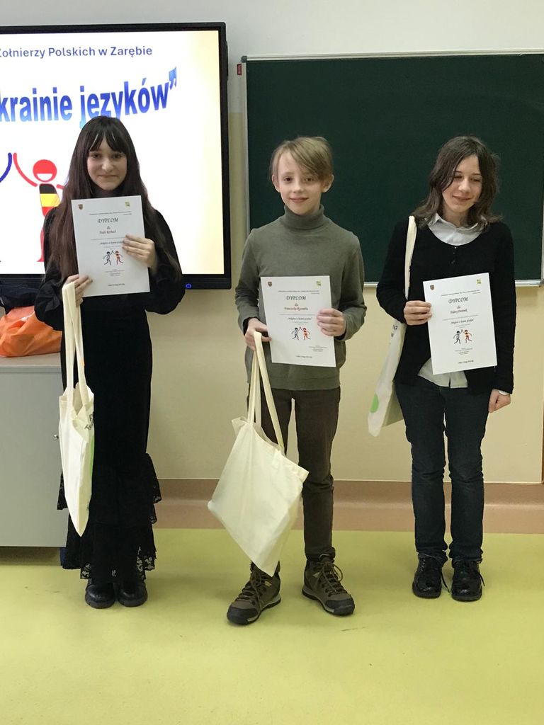 W pierwszej kategorii z języka angielskiego naszą szkołę reprezentowały Maja Dudzik –klasa III, Hanna Zięba – klasa III i Karolina Szatkowska – klasa IV. Choć dziewczynki nie zdobyły żadnego miejsca, to należą im się ogromne gratulacje za poziom wykonania prac konkursowych.