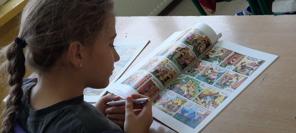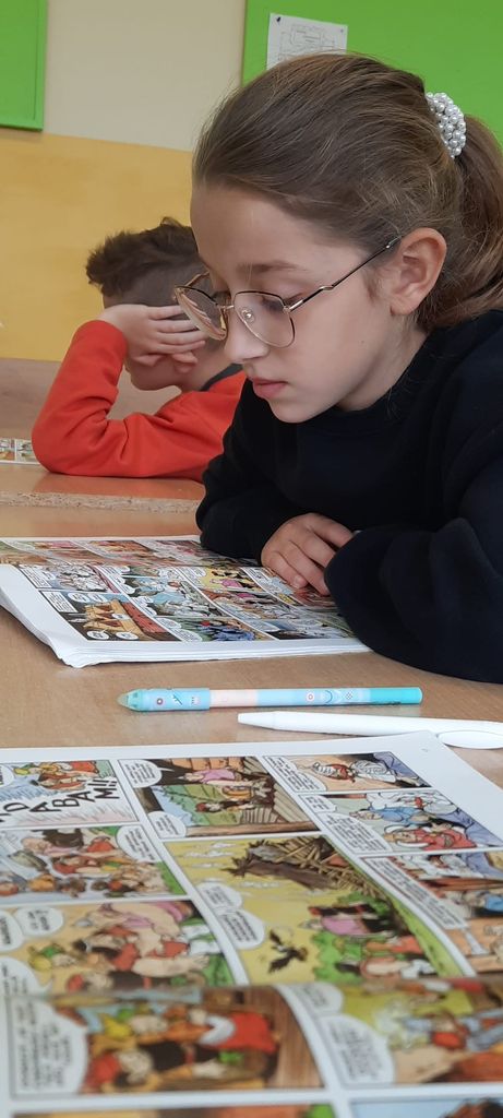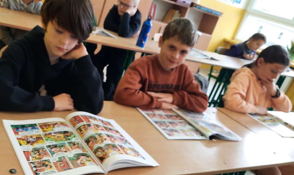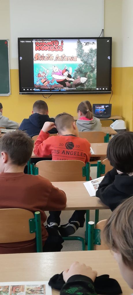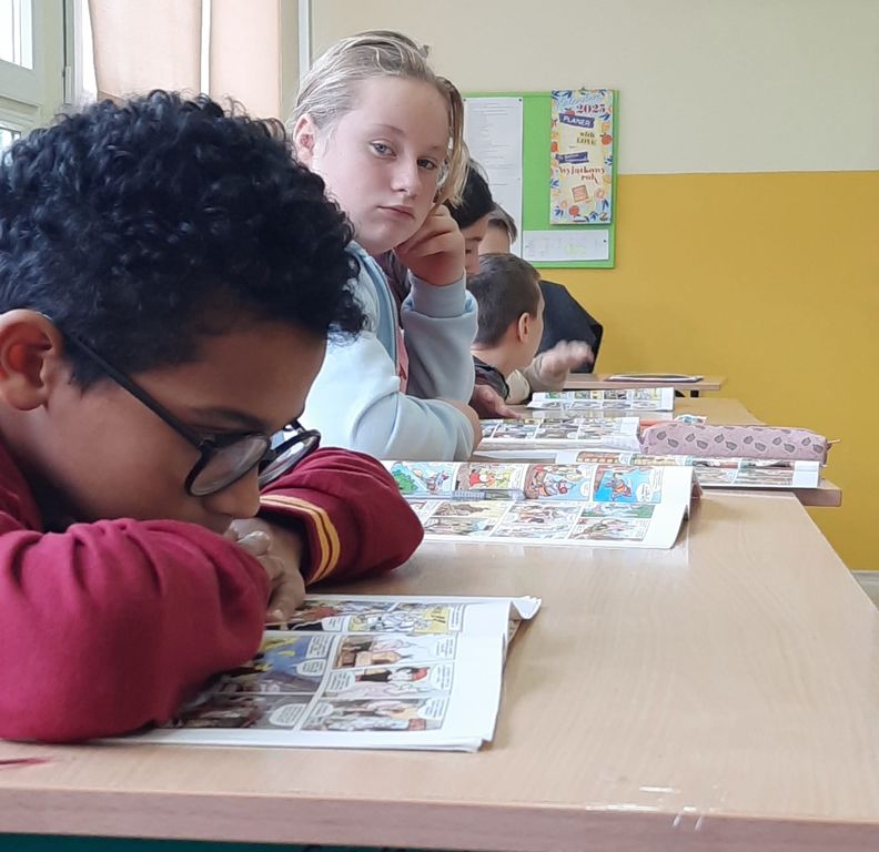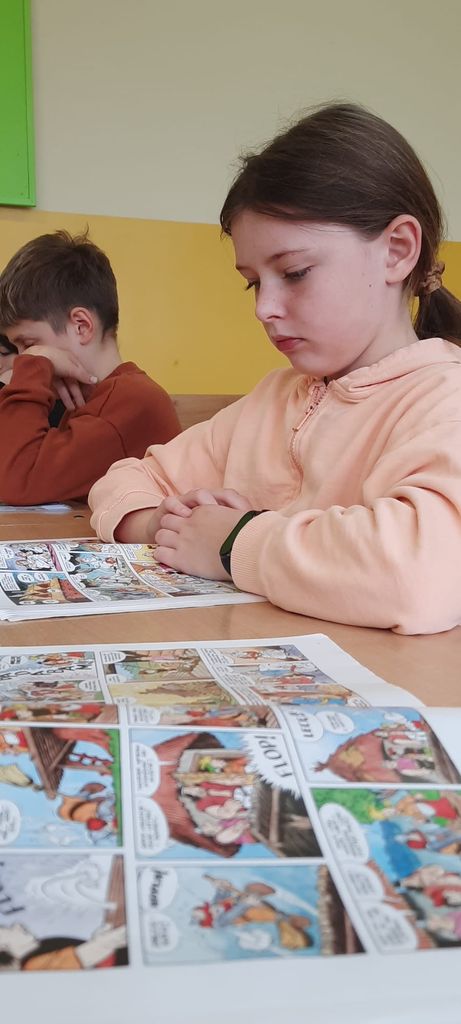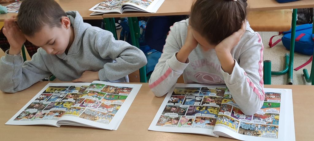 W trakcie zajęć każdy uczeń miał możliwość śledzenia tekstu, który był odczytany przez lektora. W ten sposób czwartoklasiści mogli bardziej utrwalili wiedzę o bohaterach, cechy tego gatunku, a także sposoby wyrażania różnych treści w komiksie.