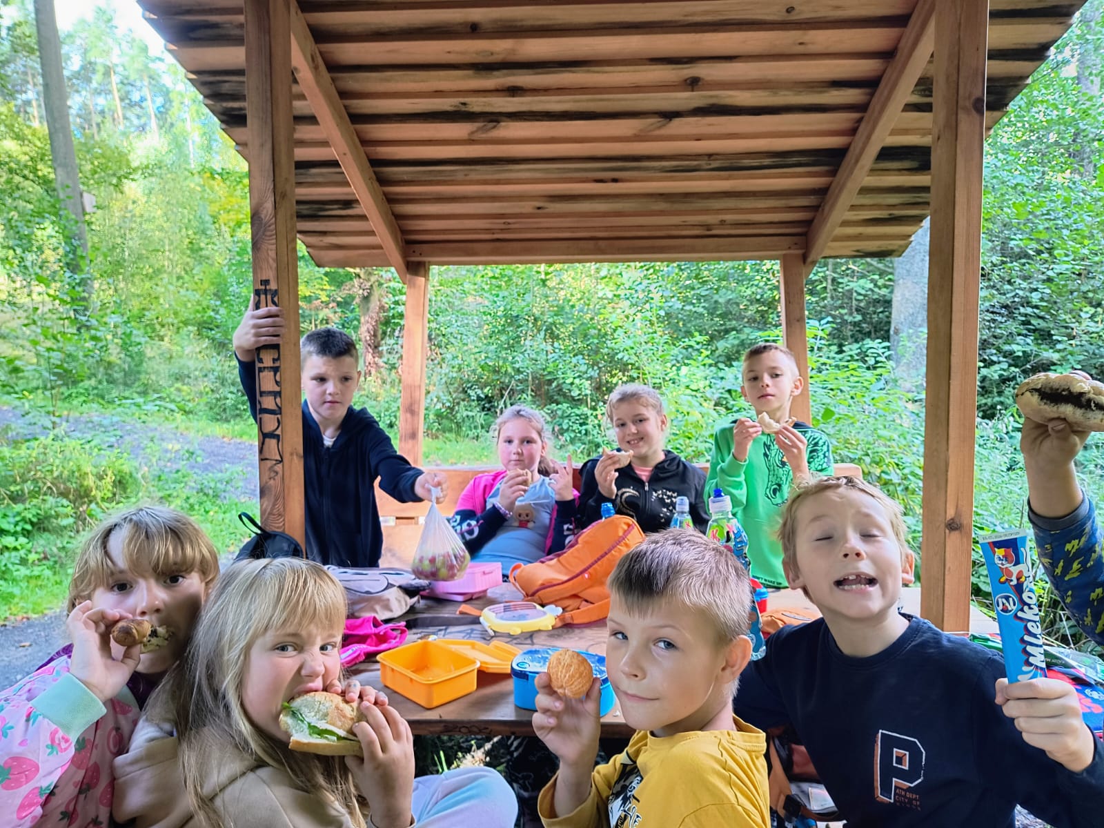 Po części edukacyjnej przyszedł czas na odpoczynek. Na leśnej łące odbył się piknik, podczas którego dzieci mogły zjeść drugie śniadanie, porozmawiać i nacieszyć się ciszą oraz spokojem natury.
