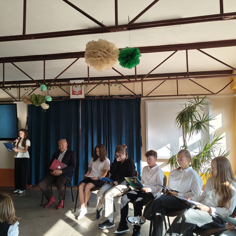 Jako pierwszy fragment ulubionej książki przeczytał Pan Dyrektor, który rozpoczął spotkanie słowami o znaczeniu literatury w życiu młodego człowieka. Następnie głos zabrała Pani od języka polskiego, prezentując fragment jednej z lektur szkolnych, pokazując, że książki uczą nie tylko języka, ale też wrażliwości i empatii. Nie zabrakło również niespodzianek – nauczyciel wychowania fizycznego zaskoczył wszystkich wyborem książki, pełnej emocjonujących opisów i inspirujących historii bohaterów. Udowodnił tym samym, że książki to nie tylko przygoda dla umysłu, ale także motywacja do działania i rozwijania pasji.