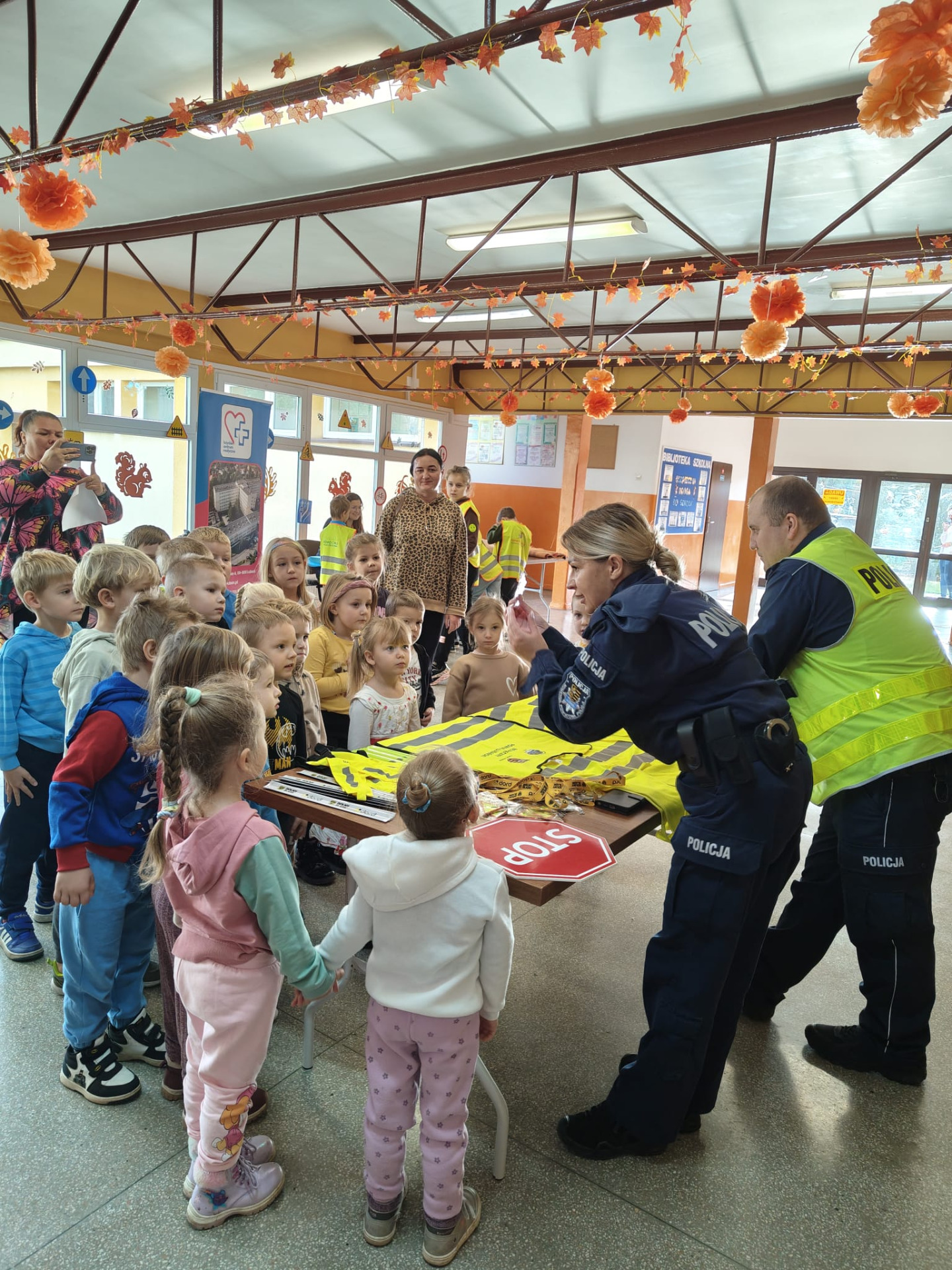 Policjant z Wydziału Ruchu Drogowego opowiadał o znaczeniu odblasków i bezpiecznych zachowań po zmroku.