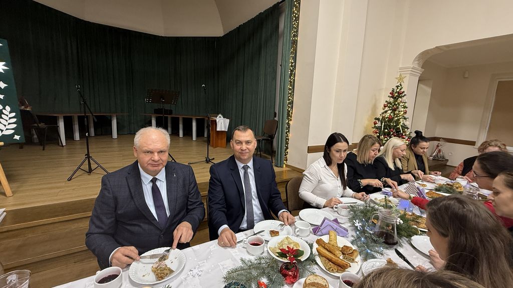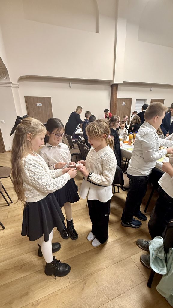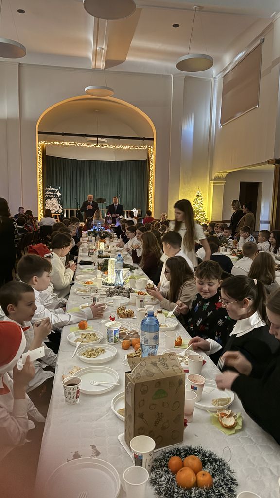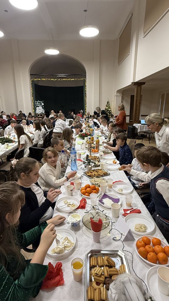 Wszyscy dzielili się opłatkiem, wspólnie jedli wigilijne potrawy i składali sobie serdeczne życzenia. Dyrektor szkoły skierował do uczniów, nauczycieli i pracowników piękne, pełne nadziei życzenia świąteczne. Uroczystość uświetnił występ artystyczny klasy V poświęcony ważnym wartościom, które łączą ludzi.