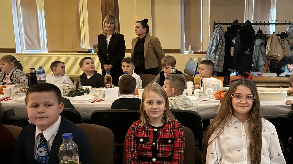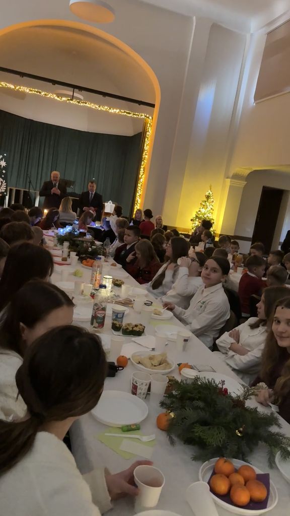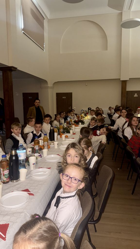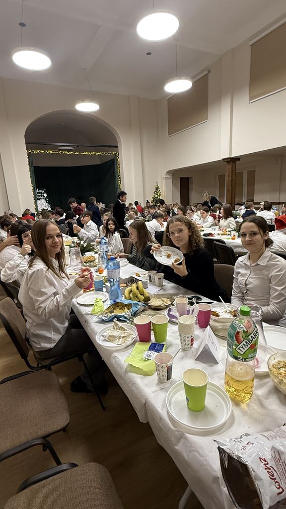 Wigilia szkolna była wyjątkowym wydarzeniem, podczas którego cała społeczność szkoły spotkała się w auli w ciepłym, świątecznym nastroju pełnym radości i życzliwości.