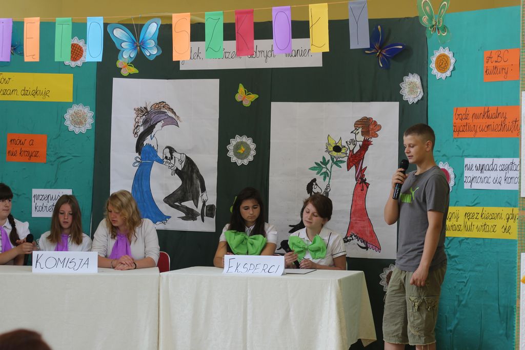 Na początku w pięknie przystrojonej auli gimnazjalnej odbyła się część artystyczna, podczas której zostały wyeksponowane aktorskie uzdolnienia wychowanków: w przedstawieniu „Kultura zachowania w różnych sytuacjach” oraz kabarecie „Wizyta rodziców ze wsi”. Występy urozmaiciła prezentacja multimedialna „Historia gimnazjum”, która wywołała żywą reakcję zebranych, wszak dotyczyła tego, co przeżyliśmy w szkole w ostatnich latach. Miłym akcentem było wręczenie upominków dla zaproszonych gości – prześlicznych ręcznie wykonanych motyli z refleksyjną sentencją: „Życie jest jak chwila, ciągle się zmienia, jak motyl barwne swe skrzydła nosi. Życie ma magię, spełnia marzenia, o drugą szansę czasem nie prosi”.